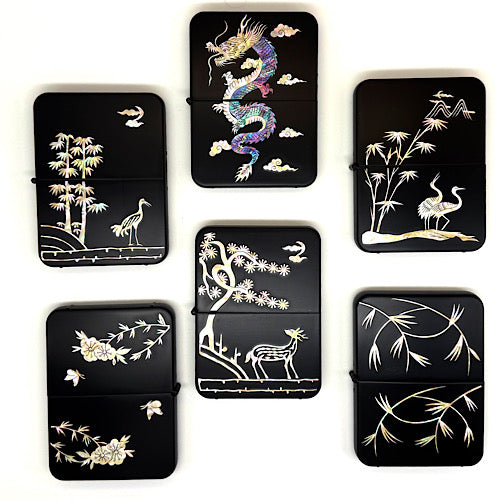 今回、色合いのキレイな螺鈿細工を黒色の樹脂製ケースに贅沢に装飾致しました。