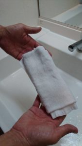 - ジップロック(ビニール袋などでも構いません)の中に、水を20ccほど入れて、先ほどのタオルを入れます。