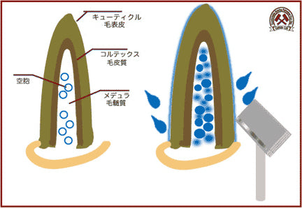 人の体毛は、表面の毛表皮(キューティクル)・毛皮質(コルテックス)・毛髄質(メデュラ)と主に3層に分かれており、メデュラの中には無数の空気の穴(空胞)があります。この空胞に水分を浸透させることで膨張と同時に柔らかくなって剃りやすくなります。シェービングブラシを利用すると、毛先が毛穴の奥にまで届くので、中まで水分を与える事ができます。さらに速やかに水分を浸透させるにはお湯が最適。これらの効果で、より深剃りが出来るようになるのです。