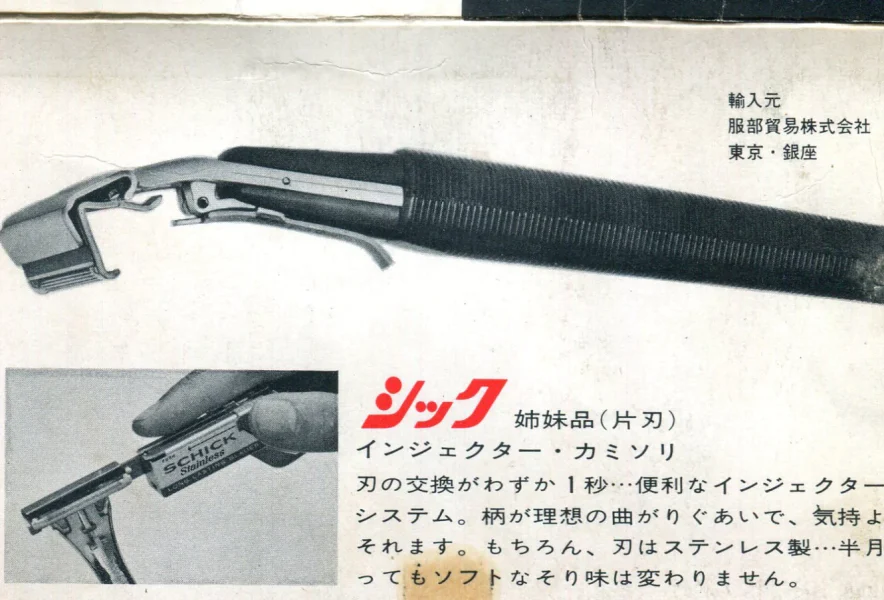 戦争が原因で機を逸し、日本人に適した片刃カミソリの販売をあきらめていた金蔵は、百貨店の外国人向けカミソリ売場に貼られていた大きなポスターで「シック」の「インジェクター」と出会います。小さな女の子がお父さんの髭を剃るそのビジュアルは、愛に溢れていると同時にインジェクターの安全性をアピールするものでした。「『インジェクター』は、独特の操作感や切れ味はもちろんのこと、刃に触れることなく安全に交換できるという点でも画期的な商品だったのです。私自身、米国留学中に現地の理容室で初めて体験し、これか、と思ったことを覚えています。(竹内康起談 ※以下略) 」これは行けると直感した金蔵は、エバーシャープシック社にサンプル送付を直談判します。